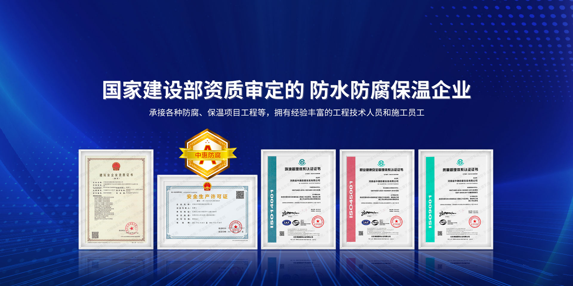 公司經營范圍:防水防腐保溫工程;消防設施工程;建筑裝修裝飾工程;建筑機電安裝工程;電力工程;建筑工程;石油化工工程;工業清洗工程;油罐清洗工程;鋼結構工程;環保工程;模板腳手架工程;電纜防火封堵、防污閃噴涂、外墻外保溫工程;各類施工勞務作業;設備維修、船舶鉚焊、涂裝;電力工程材料、建材、防水材料、防火材料、防腐保溫材料銷售,并相繼通過了GB/T19001-2008idtISO9001:2008GB/T50430-2007質量管理體系認證證書。GB/T24001-2004idtISO14001:2004環境管理體系認證證書。GB/T28001-2011idtOHSAS18001:2007職業健康安全管理體系認證證書。公司是中國防腐蝕于防護協會、中國施工企業管理協會、電力協會和中國鋼結構防水協會會員單位。 公司的經營業務涵蓋了石油、化工、電力、冶金、煤炭、船舶、國防、燃氣、水利、環保、交通運輸、航空及國防軍工和輕紡市政等行業的防腐保溫絕熱設備。鋼結構安裝、防火、防水、金屬噴鍍、聚脲噴繪、陰極保護、防滲透堵漏、玻璃鋼及各種磚版材料襯里、橡膠襯里、煙氣硫和耐酸溶劑腐蝕等工程施工。公司連續十年榮獲“省市先進施工企業”“安全生產先進單位”“重合同,守信用企業”和“AA***資質企業”的稱號。2000年被命名為市級文明單位,2002年被國家工商行政管理局命名為“重合同,守信用的企業”、被中國工業防腐蝕技術協會命名為“防腐蝕企業,能源節約及環境保護領域有豐富的經驗和***的業績。工程一次交驗合格率100%。其中攀枝花鋼鐵公司煉鐵廠四號高爐及熱風爐防腐工程、上海寶鋼公司煤氣柜防腐工程、撫順石油一廠裝置防腐項目、齊魯石化公司稀烴廠高塔防腐工程、吉林化學工業公司煉油廠油罐防腐工程、天津石化熱電廠六號爐頂棚聯絡管保溫工程、大慶油田(太倉)力神泵業工程、中國化學工程第十一建設工程、中原油田勘探局工程、中國石化銷售有限公司華北分部、魯皖輸油管道工程、貴州開磷息烽合成氨工程、陜西黃陵煤化工程、中國石油天然氣西部管道塔里木輸油工程、邯鋼集團邯寶鋼鐵公司煉鐵工程、德州供電工程、吉寶(南通)船廠工程,偃師華潤熱力工程、鄭州熱力總公司。 河南省中惠防腐安裝有限公司愿以豐富的施工經驗,***的技術,***的設備,***的管理,***的服務,竭誠為國內外廣大的用戶提供***滿意、******的工程作品?! ∥夜驹概c國內外同仁一道,團結協作,共同推進防腐蝕行業發展! 公司地址:河南省長垣縣建設路北段360號 固定電話:0373-8866488 郵編:453400 網址:http://www_zhff_com_cn.feilesc.com